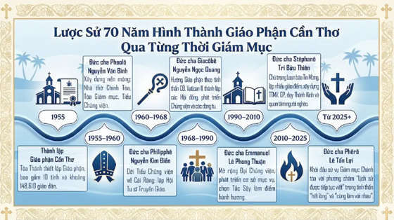 Hướng về ngày kỷ niệm 70 năm thành lập Giáo phận Cần Thơ (1955–2025), Ban Biên soạn Giáo phận Cần Thơ (BBS – GPCT) xin giới thiệu đến cộng đoàn Dân Chúa loạt 6 bài viết – 6 poster, tái hiện lại hành trình lịch sử của Giáo phận qua 6 đời các Đức Giám mục đã và đang phục vụ.