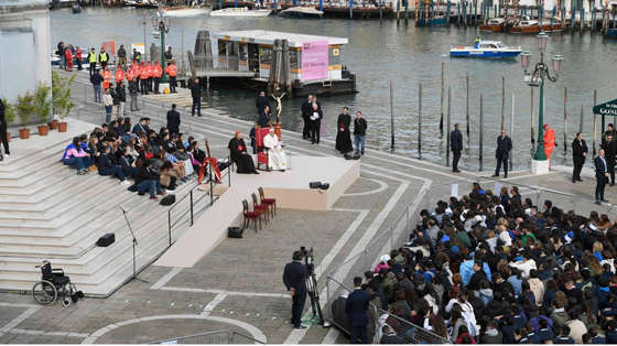 Sau khi gặp các nghệ sĩ, Đức Thánh Cha đã di chuyển bằng ghe đến trước Vương cung Thánh đường Đức Mẹ Sức khoẻ để gặp gỡ các bạn trẻ. Khoảng 1500 bạn trẻ đứng tại quảng trường Đức Mẹ Sức khoẻ để chờ chào đón Đức Thánh Cha. Trong bài nói chuyện với các bạn trẻ, Đức Thánh Cha không chỉ dùng bản văn đã được soạn sẵn, nhưng nhiều lần bỏ giấy để đối thoại với các bạn trẻ. Ngay từ lời chào đầu, ngài dí dỏm nói: “Ngay cả mặt trời cũng cười!”Với vẻ đẹp của thành phố Venezia, Đức Thánh Cha nói rằng: “Hôm nay chúng ta ở đây để tái khám phá vẻ đẹp của chúng ta trong Chúa và vui mừng nhân danh Chúa Giêsu, Thiên Chúa trẻ, Đấng yêu người trẻ và là Đấng luôn làm chúng ta ngạc nhiên”. Và ngài đã dùng hai động từ nói về mẹ Maria để nói với các bạn trẻ: “đứng dậy và lên đường” (Lc 1:39).