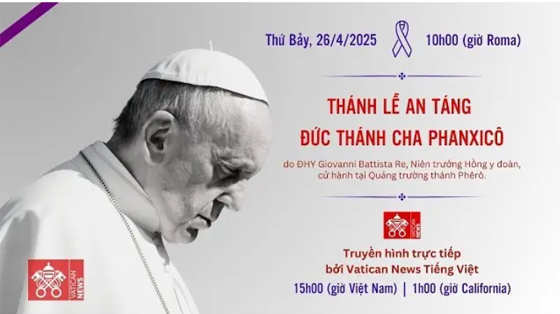 Vatican News Tiếng Việt truyền hình trực tiếp Thánh lễ An táng Đức Thánh Cha Phanxicô tại quảng trường Thánh Phêrô ngày thứ Bảy 26/4 lúc 10:00 giờ Roma (15g00 giờ Việt Nam)