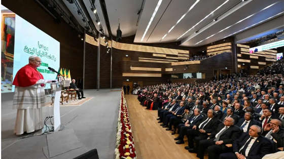Sau đó, Đức Thánh Cha đến Trung tâm Hội nghị Djamaa el Djazair để gặp gỡ khoảng 1.400 đại diện giới chức chính quyền, xã hội dân sự và ngoại giao đoàn. Trong diễn văn đáp từ sau lời chào mừng của Tổng thống Tebboune, Đức Thánh Cha đã nhấn mạnh đến tinh thần đối thoại và khát vọng hòa hợp giữa các dân tộc. Ngài nói: