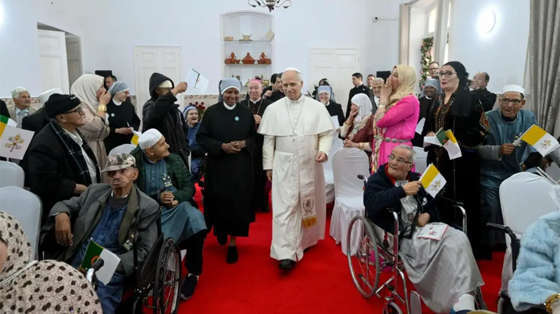 Vào khoảng 11 giờ 30, Đức Thánh Cha di chuyển đến Nhà dưỡng lão của Dòng Tiểu Muội Người Nghèo, nằm trên đồi Lala Bouna, bên cạnh Đền thờ Thánh Augustinô. Đây là một cơ sở đón tiếp và chăm sóc những người cao niên nghèo hoặc không nơi nương tựa, trong đó phần lớn là người Hồi giáo, thể hiện cách cụ thể tinh thần phục vụ không phân biệt tôn giáo của Giáo Hội.